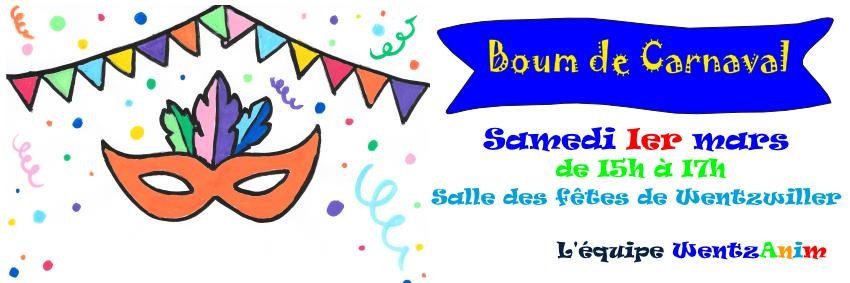 Samedi 1er mars, parez-vous de vos plus beaux costumes et de vos masques les plus fous ! L'association WentzAnim convie les enfants de 3-12 ans à une boum de Carnaval de 15h à 17h, musique, jeux d'ambiance et stand goûter au programme !