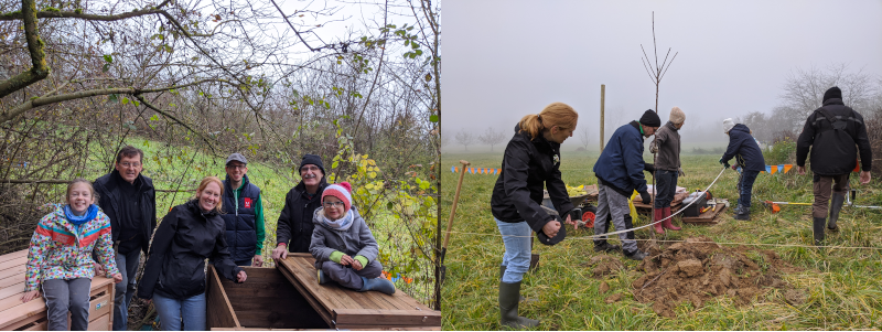 Une équipe de neuf personnes s'est retrouvée samedi 23 novembre pour planter les premiers arbres et installer les bacs à compost et broyât. Action réalisée avec le sourire, malgré la brume !