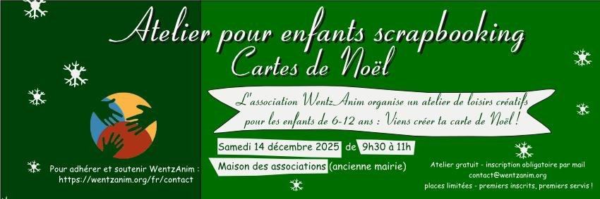 Samedi 14 décembre, de 9h30 à 11h, l'association WentzAnim convie les enfants de 6-12 ans à un atelier créatif de scrapbooking pour créer des cartes de Noël ! L'atelier aura lieu à la maison des associations (ancienne mairie, 2 rue du ruisseau à Wentzwiller).