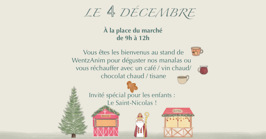 Ce samedi 4 décembre, il y aura des Manalas au marché de Wentzwiller, de 9h à 12h ! Venez passer un bon moment avec l'association WentzAnim autour d'un café, d'une tisane, d'un chocolat chaud ou d'un vin chaud !