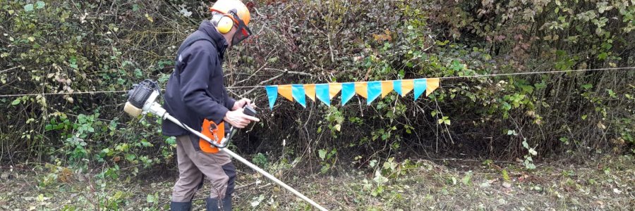 Une équipe s'est mise à l'oeuvre pour délimiter la parcelle du jardin partagé ce samedi 2 novembre. Une demie-journée de travail bottes aux pieds et sourires aux lèvres a permis de nettoyer les abords du terrain et mettre en place des fanions colorés.