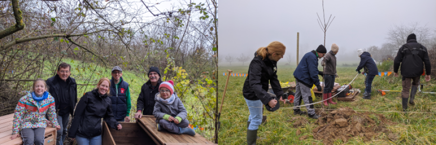 Une équipe de neuf personnes s'est retrouvée samedi 23 novembre pour planter les premiers arbres et installer les bacs à compost et broyât. Action réalisée avec le sourire, malgré la brume !