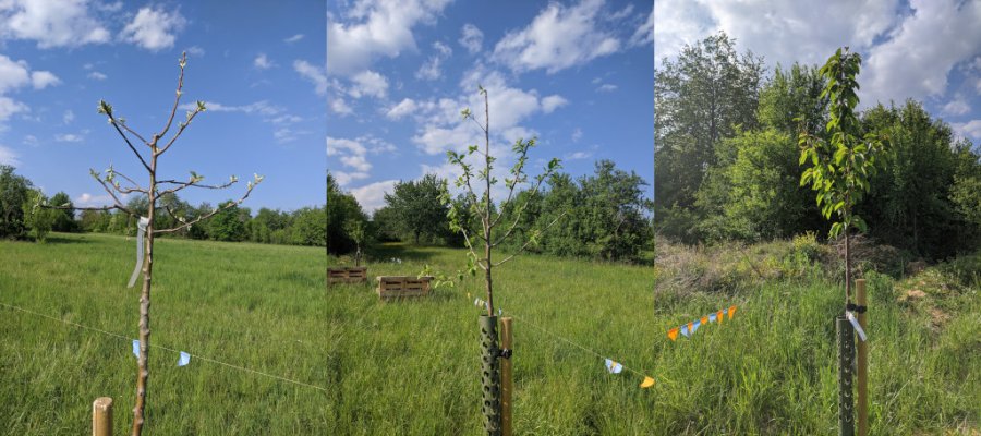 Notre parcelle de jardin partagé est au repos forcé. Toutefois, les arbres que nous avons plantés cet automne ont pris racine et se décorent de belles feuilles bien vertes en attendant des jours meilleurs où nous retournons au jardin pour créer les espaces de plantation.