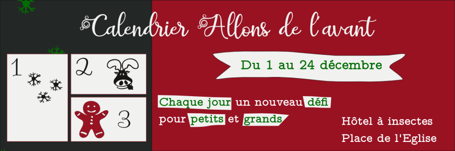 À partir du 1 décembre et jusqu'au 23, vous pouvez participer aux défis du calendrier Allons de l'avant ! qui se trouve à l'hôtel à insectes sur la place de l'Église.
